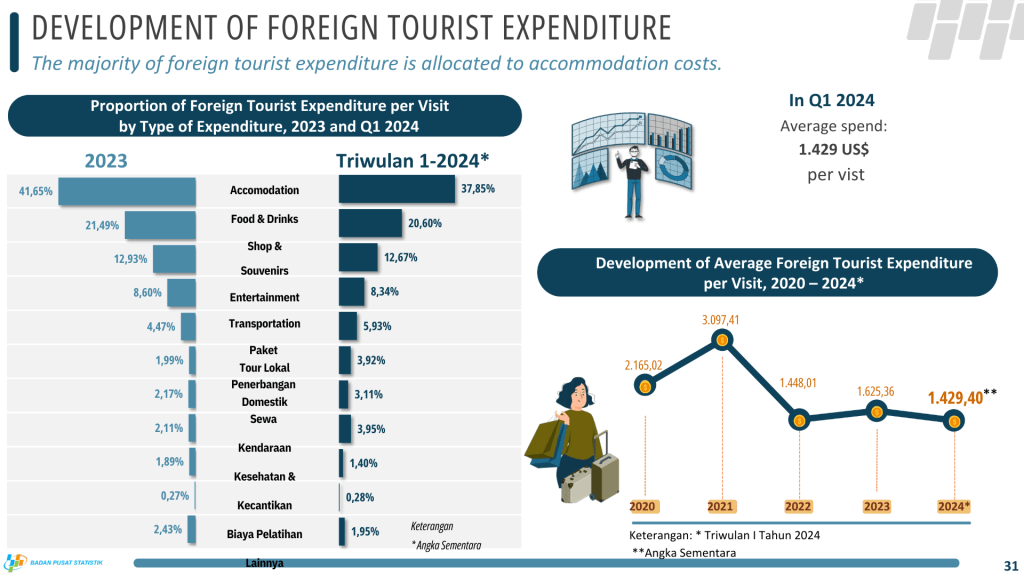 To identify key insights, I started with the Proportion of Foreign Tourist Expenditure per Visit by Type of Expenditure chart on the left side of the image. Among the 13 categories, the top two stood out the most, accounting for 50% of the total spending. This immediately reminded me of the Pareto Principle, where 20% of the inputs often drive 80% of the outcomes. By focusing on these top-performing categories, I could prioritize efforts to maximize impact